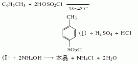 1.由對甲苯磺酰氯與氨水反應(yīng)而得。工藝流程:先向胺化鍋中放入適量的冰水,再將按質(zhì)量配比(對甲苯磺酰氯:純氨=1:0.2)計量好的對甲苯磺酰氯和氨水依次放入鍋中,開動攪拌器,利用胺化鍋夾套的冷液控制鍋內(nèi)溫度至70℃左右(該反應(yīng)大量放熱),然后降溫至30℃左右出料。胺化物放入過濾桶過濾,并用溫水洗滌,吸干則得固體粉狀粗品對甲苯磺酰胺。粗品對甲苯磺酰胺含有少量的鄰位體信副產(chǎn)品油狀有色物質(zhì)。利用對位胺易溶于氫氧化鈉液的性質(zhì)及用活性炭脫色,可達(dá)到提純精制目的。物料質(zhì)量配比為粗對位胺:30%氫氧化鈉液堿:水=100:45:1300;粗對位胺:活性炭=100:(2.5-3.5)。按此配方量將水和燒堿放入提純鍋中,打開夾套蒸汽閥加熱至70℃,再加入配方量的粗對位胺,開動后攪拌器,待粗對位胺全部溶解時,分次加入配方量的活性炭,繼續(xù)攪拌0.5h,將料液放入過濾桶,趨熱過濾,用熱水洗滌,吸干。濾液隨即打入精制鍋,用鹽酸中和至ph值=2-3,降溫至30-35℃左右,將料液放入過濾桶過濾,再用水洗至中性,移入離心機(jī)離干,即為含水10%的成品,若需要干品,則送到氣流烘干器烘干,得含水1%的對甲苯磺酰胺成品。2. 將對甲苯磺酰氯與純氨依次加入冰水中,控制對甲苯磺酰氯與純氨的質(zhì)量配比為1∶ 0.2,攪拌下進(jìn)行反應(yīng),冷卻并控制溫度為70℃。反應(yīng)結(jié)束后,經(jīng)冷卻、過濾、洗滌得粗品,粗品經(jīng)堿洗、脫色、水洗、中和、過濾、水洗、干燥即得成品。