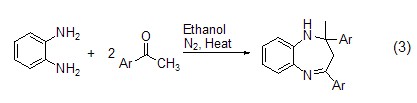 利用鄰苯二胺及其衍生物與2-乙?;拎樵希詫?duì)甲苯磺酸為催化劑,在甲醇溶劑中,加熱 (50~60 oc) 攪拌反應(yīng)10~20 h卻得到了苯并六元環(huán)產(chǎn)物 (式2)[4,5]。