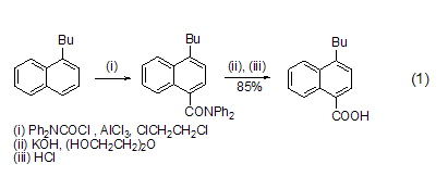 羧基的引入 在alcl3催化下,dpc-cl 可在芳環(huán)上引入一個(gè)羧基。烷基或烷氧基取代的芳環(huán)容易發(fā)生反應(yīng)。產(chǎn)物二苯基酰胺用堿水解,再酸化可得到羧酸 (式1)[1]。