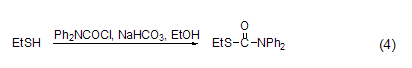 與巰基的反應(yīng) 在堿性條件下 (如nahco3),在乙醇溶液中dpc-cl可與硫醇反應(yīng) (式4)[8]。