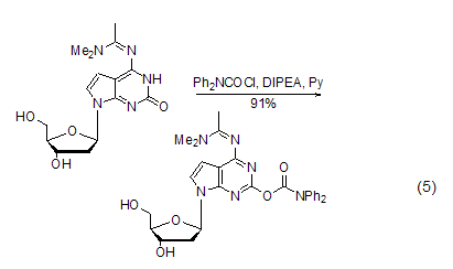 用作寡聚核苷酸合成時(shí)的保護(hù)基 在合成寡聚核苷酸時(shí),鳥嘌呤核苷的堿基容易發(fā)生副反應(yīng),需要加以保護(hù),dpc-cl可以將鳥嘌呤堿基的烯醇異構(gòu)體?;鴮ζ溥M(jìn)行保護(hù),這種方法在合成具有鳥嘌呤堿基和與鳥嘌呤堿基類似的核苷化合物時(shí)[9~12],發(fā)揮著重要作用 (式5)。